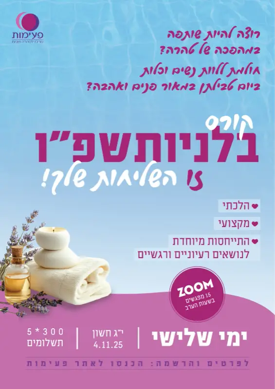 רוצה להודות למרכז פעימות על קורס הדרכת כלות ובלניות מקצועי , מרתק והכי חשוב מענה אישי לכל שאלה!!! פשוט זכות להיות חלק וללמוד מטובי המרצים והכל באווירה נעימה ומשפחתית!!! ממליצה לכל אחת!!!
